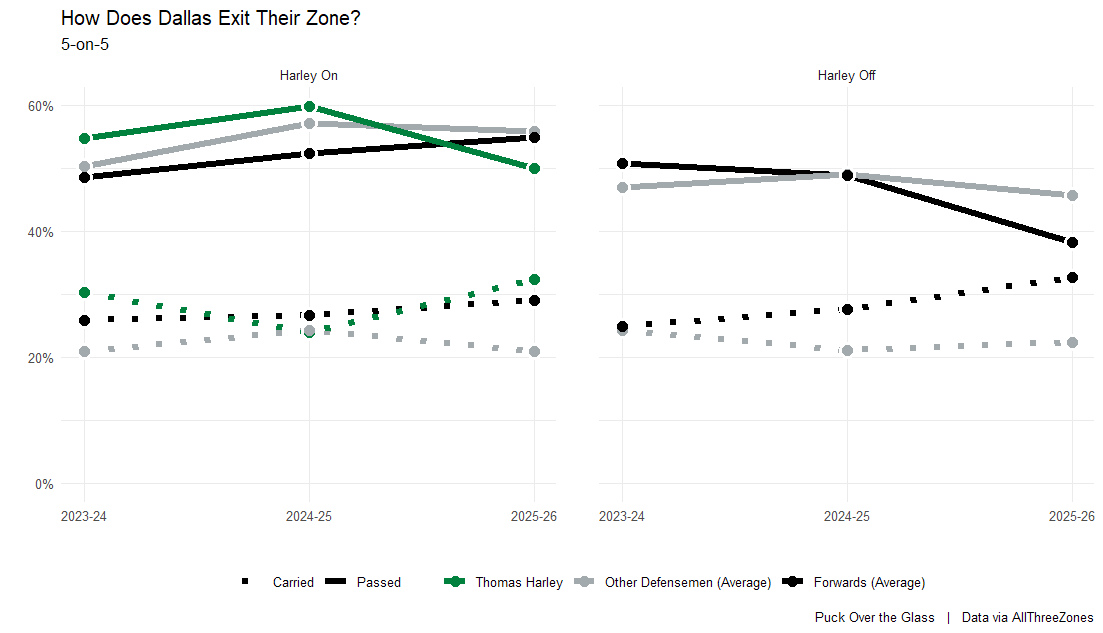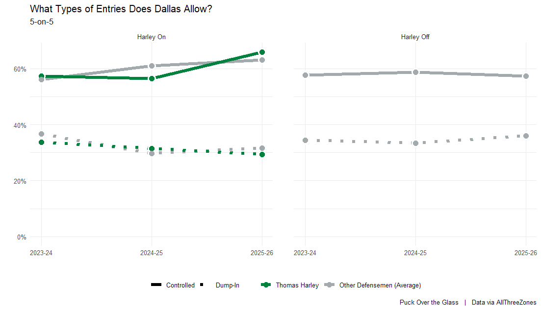 To sum things up: Harley is skating less, but so is the entire Stars defense. Harley is handling a larger share of puck retrievals and zone exits than last season and seeing less success than previously but his partners have been especially bad in this regard. When defending zone entries, both Harley and his partner have been abysmal at preventing entries, and particularly poor at defending dump-in pucks. On entries, Harley’s partner is similarly ineffective and entries are less dangerous when he’s on the ice than on the bench. In zone, Harley has been less involved in shooting the puck and appears to be more static on offense than he was from 2023-25, along with being ice cold as a shooter. Finally, on defense, Harley and his partner have been awful at preventing royal road passes.